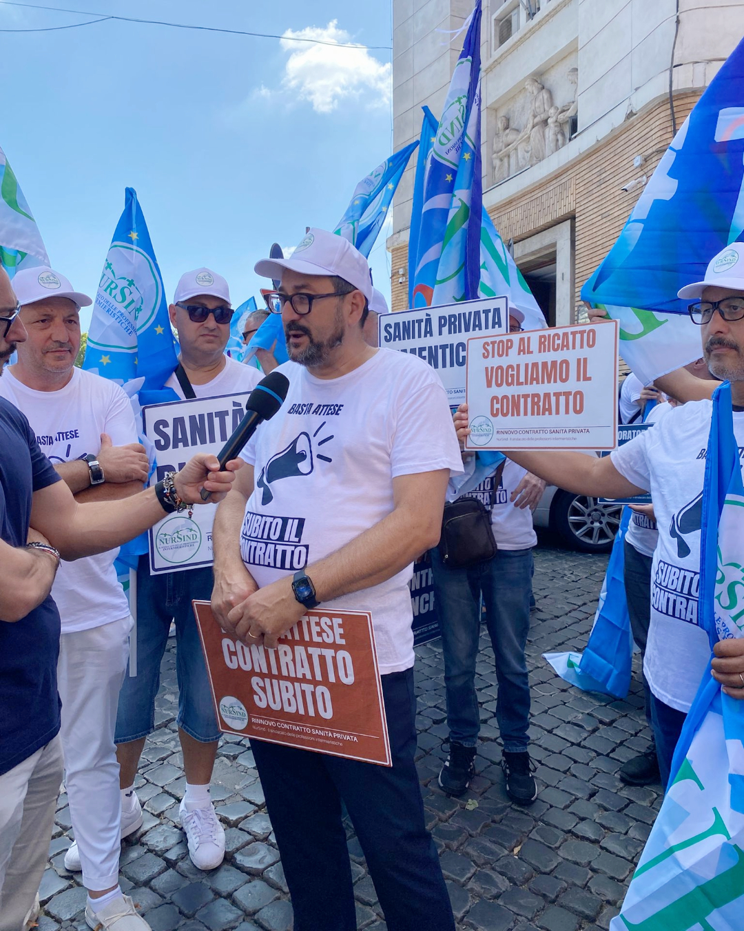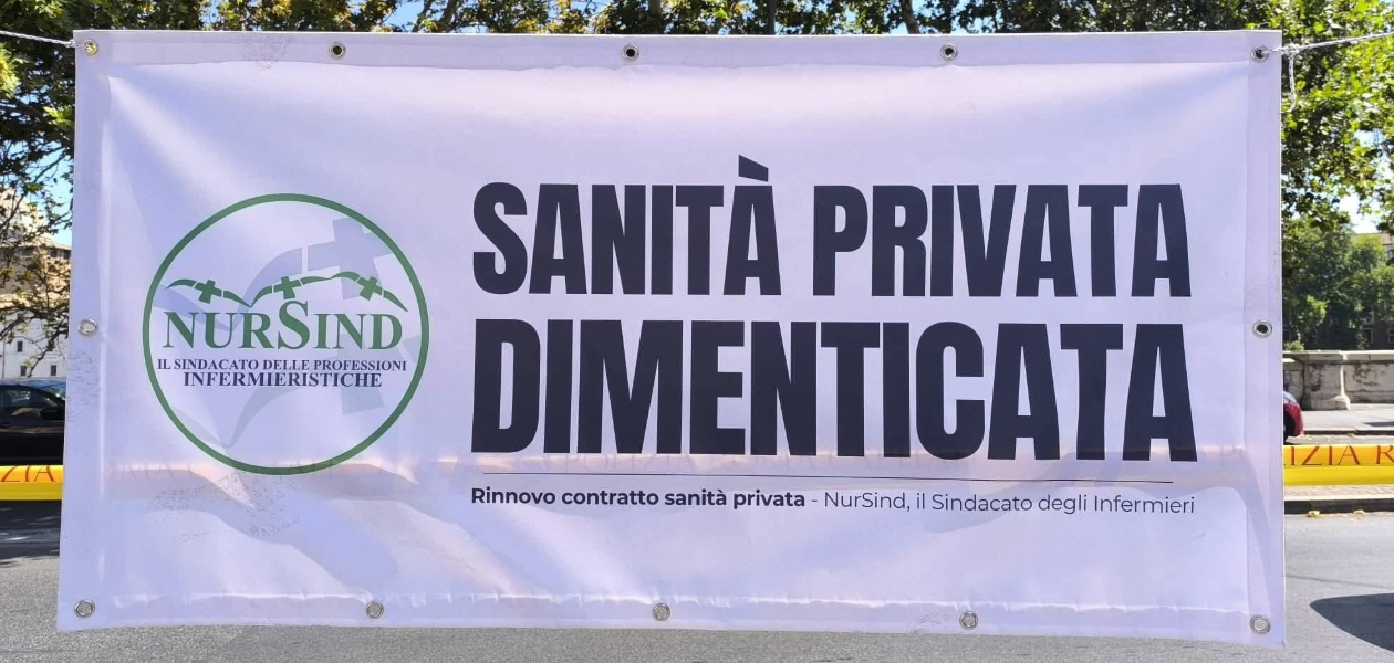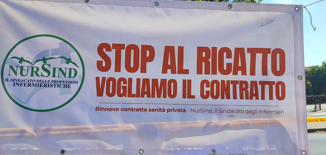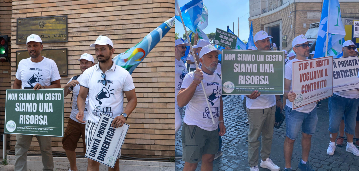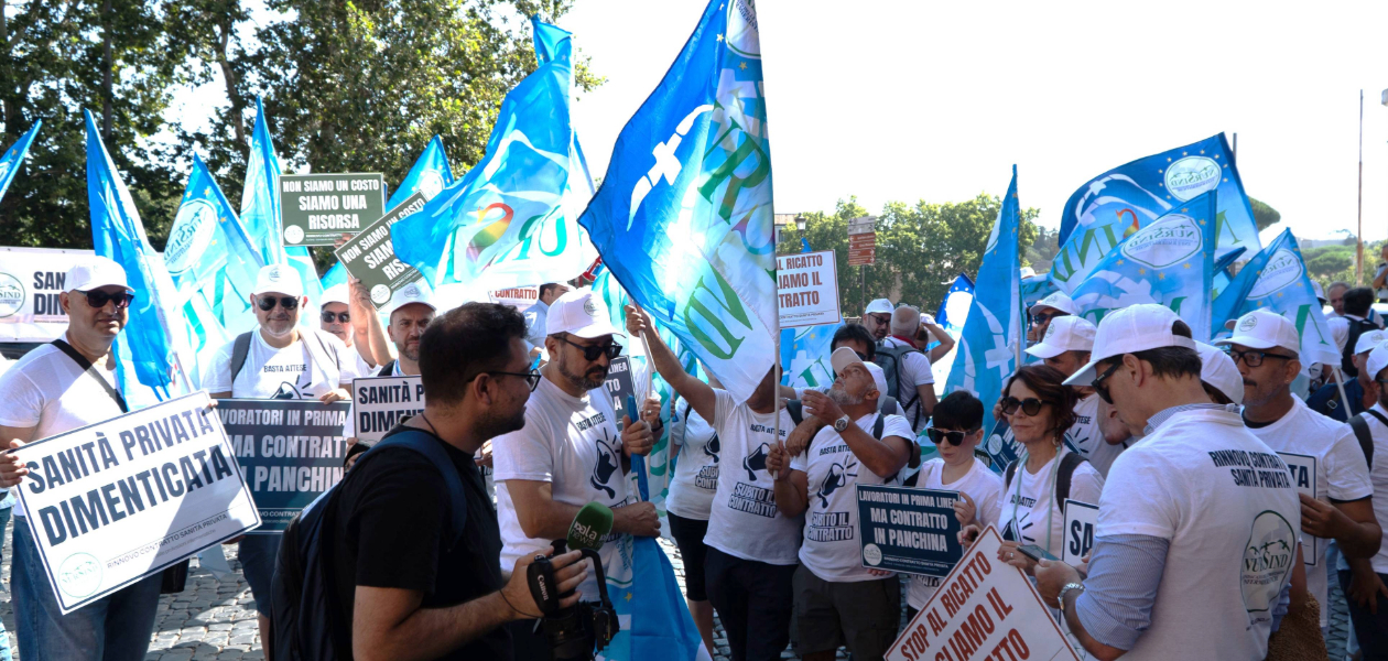 “Sanità privata dimenticata”, “Non siamo un costo, siamo una risorsa”, “Stop al ricatto, vogliamo il contratto”.