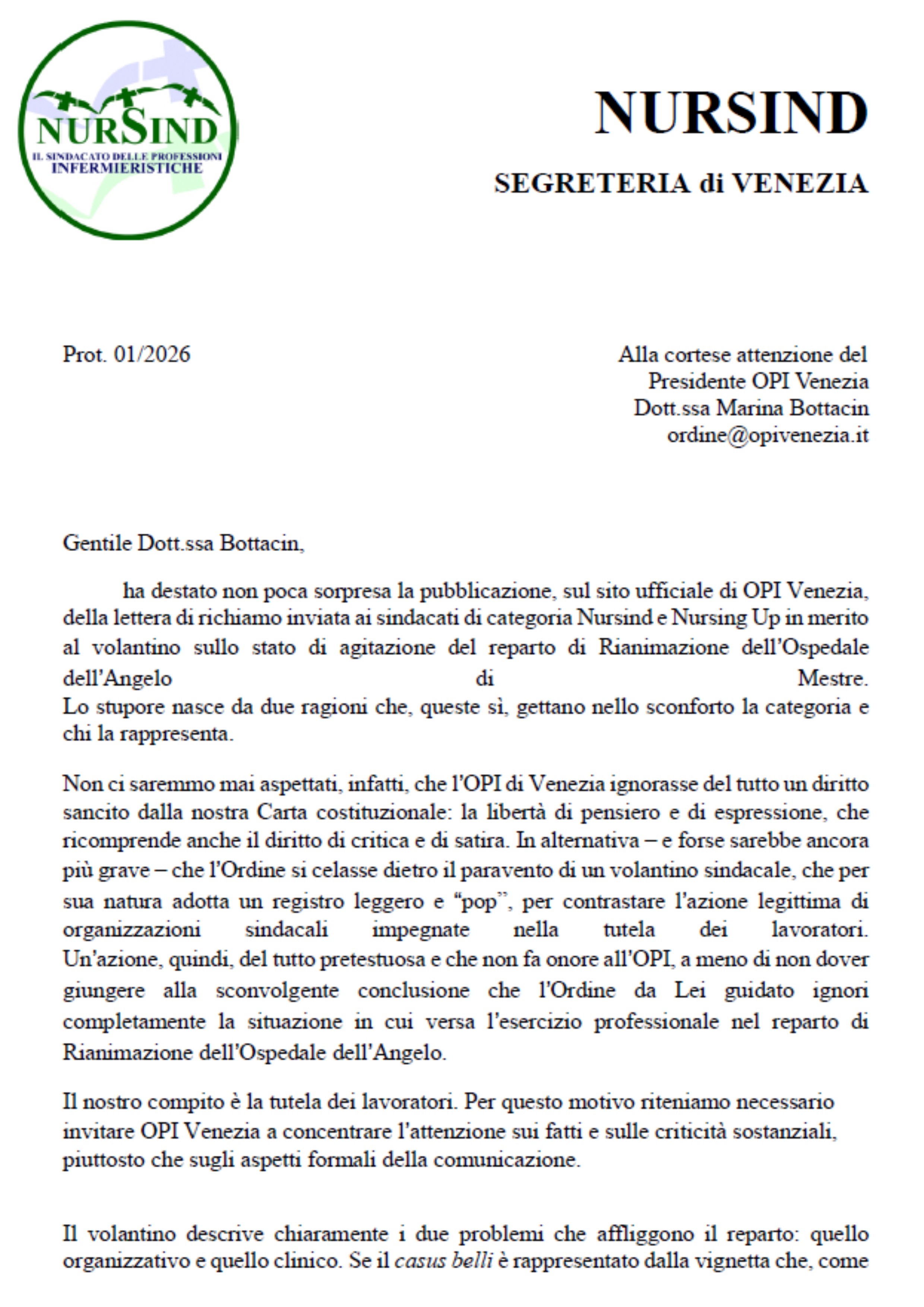 Mentre lo stato d’agitazione va avanti, il 26 gennaio scorso, l’Opi Venezia ha pensato bene di confondere le acque con un richiamo al nostro sindacato, usando a pretesto la vignetta contenuta in un volantino sindacale. Un’azione, come rimarca la segretaria territoriale Nursind Venezia Sara Presutto nella missiva di risposta all’Ordine, inviata il 6 febbraio, che desta meraviglia perché cela una “deliberata volontà di spostare l’attenzione dai problemi reali, dimostrando un completo disinteresse e la totale assenza di qualsiasi riferimento alla grave situazione in cui operano gli infermieri clinici”. E ancor più perché mostra “quanto l’Ordine appaia distante dai disagi che gli infermieri vivono quotidianamente e come la difesa concreta della professione sia demandata esclusivamente alle organizzazioni sindacali di categoria”.