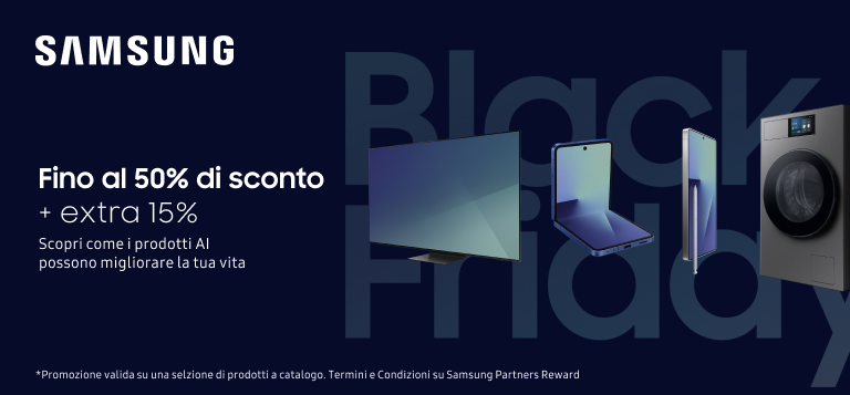 Nota: * Iniziativa valida dalle ore 09:00:00 del 27 ottobre 2025 alle ore 08:59:59 del 27 novembre 2025 per tutti coloro che utilizzino il codice sconto “BF2025” in fase di acquisto su Samsung Partners Reward. Il codice dà diritto ad uno sconto variabile dal 5% al 15% sul prezzo di vendita di un prodotto a marchio Samsung appartenente alle seguenti categorie: Mobile/Accessori Mobile, Elettrodomestici, TV & AV ed Informatica. Il valore dello sconto varia in base al prodotto a marchio Samsung che si intende acquistare. Lista completa dei prodotti coinvolti nella promozione e relativo valore dello sconto qui. Il codice sconto non è rimborsabile, non dà diritto a resto e non si applica ad eventuali spese di spedizione. Il codice sconto non è applicabile nel caso in cui si noleggi uno dei prodotti con il servizio Smart Upgrade. L’iniziativa non è cumulabile con codici sconto emessi da Samsung Electronics Italia S.p.A. e spendibili su Samsung Partners Reward. Prezzi e disponibilità dei Prodotti Promozionati sono soggetti a variazioni. Agli acquisti si applicano le Condizioni Generali di vendita di Samsung Shop Online.